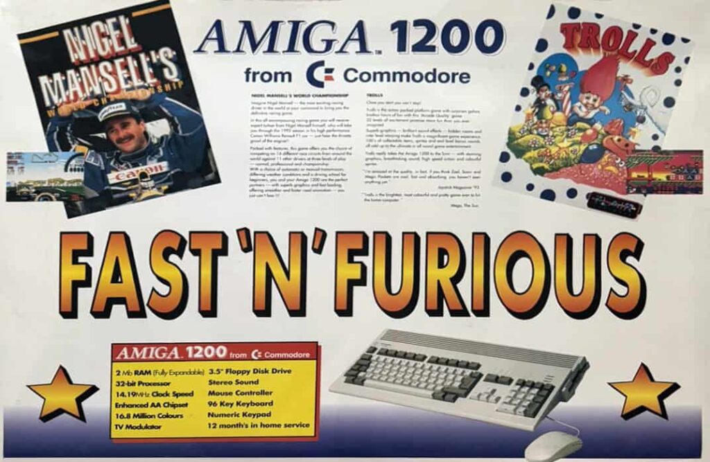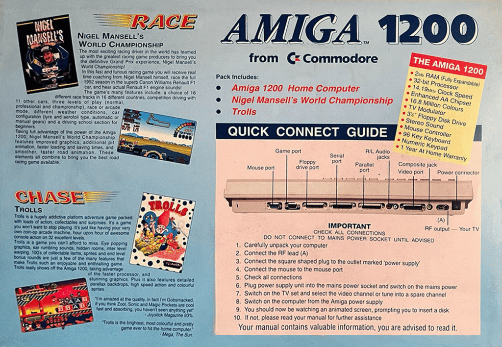 What came in the Box: A1200 Computer, Workbench 3.0 (6 Disks), Nigel Mansell World Championship AGA, Trolls AGA